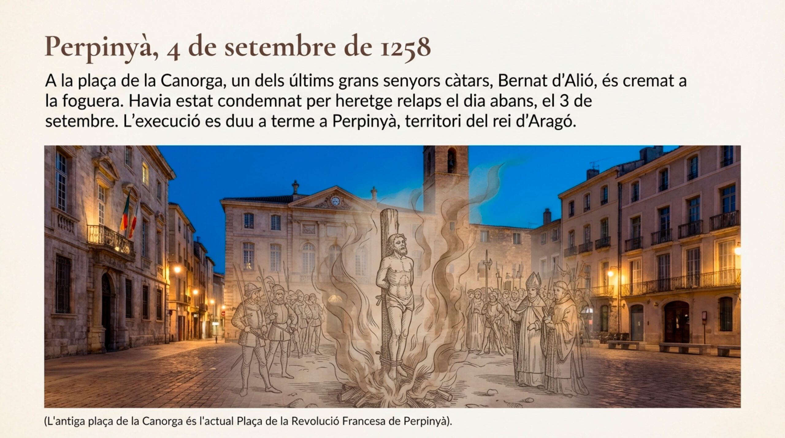 - 4 de setembre de 1258: Menys de vint-i-quatre hores després, va ser cremat a la foguera a la Plaça de la Canorga (actual Plaça de la Revolució Francesa) de Perpinyà.